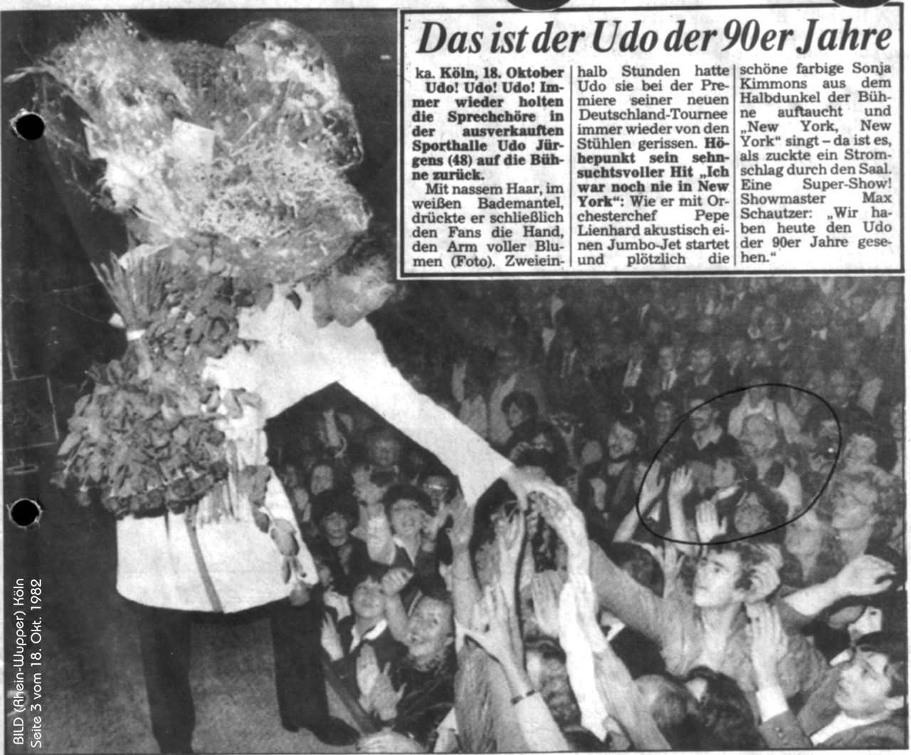 Von der Tournee 1982/83 "Lust am Leben” habe ich nun leider keine eigenen Fotos, jedoch noch meine Eintrittskarte der Tourneepremiere vom 15. Oktober 1982 (siehe Foto). Ebenso erhalten hat sich ein Artikel samt Foto aus der BILD-Zeitung vom 18.10.1982 über ebendiese Tourneepremiere in der Kölner Sporthalle, wo ich erneut Anfang Oktober 1994 kurz nach Udo Jürgens’ 60. Geburtstag wiederum zur Tourneepremiere zu Gast war. (Zwischenzeitlich ist sie – die Kölner Sporthalle – der Abrissbirne zum Opfer gefallenen.) Mein Vater ist zu erkennen, ich auch, mein jüngerer Bruder – zu seinem größten Bedauern – jedoch nicht. Er muss in den Publikumsmassen irgendwie untergegangen sein, ist aber dann recht bald wieder aufgetaucht.